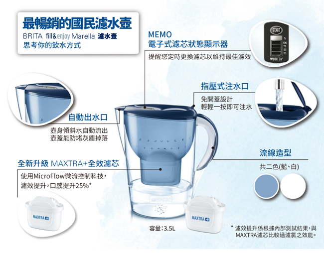讚品牌-德國BRITA 3.5公升Marella馬利拉濾水壺+1入MAXTRA Plus濾芯 (共2芯)■濾效全面提升:過濾面積增加30%,口感提升 25% ■免開蓋注水設計、指壓式進水口:單手即可裝水 ■MEMO電子式濾芯狀態顯示器:貼心提醒濾芯更換時間 ■大容量,居家和辦公室皆適用 ■可放入洗碗機清洗(壺蓋除外)